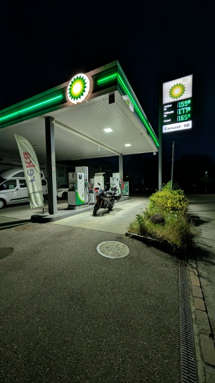 Kurz nach halb fünf Uhr morgens startete die Tour. Mein erstes Ziel war der Klausenpass. Bis nach Altdorf fuhr ich auf der Autobahn. Es war noch kühl, und ich war dankbar für die Griffheizung der Suzuki GSX S1000 GX. Der Tempomat bewahrte mich vor unnötigen Bussen. Im Kanton Uri konnte ich die Autobahn verlassen. Nachdem ich ein paar Bauern mit ihren Milchtanks überholt hatte, gehörte die Straße mir, und ich konnte sie in vollen Zügen genießen. Oben auf dem Pass angekommen, gab es das erste Pass-Selfie mit dem Schild der Passhöhe. Leider war das Restaurant noch geschlossen, also fuhr ich ohne einen erfrischenden Kaffee weiter. Nun ging es hinunter ins Glarnerland, denn der nächste Pass sollte der Flüelapass sein. Doch zuvor legte ich einen kurzen Zwischenstopp an einer Tankstelle ein – ich brauchte dringend einen Kaffee.