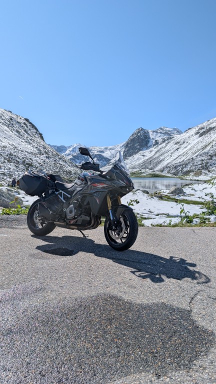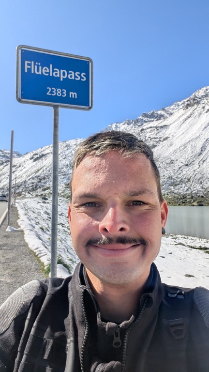 Am Flüelapass begegnete ich den ersten Motorradfahrern und freute mich auf den kommenden Tag. Man könnte nun meinen, dass ich die Griffheizung inzwischen ausgeschaltet hätte – falsch gedacht. Auf dem Flüelapass lag noch etwas Schnee, und es hatte nur etwa fünf Grad Celsius. Oben angekommen trank ich kurz etwas und fuhr weiter.