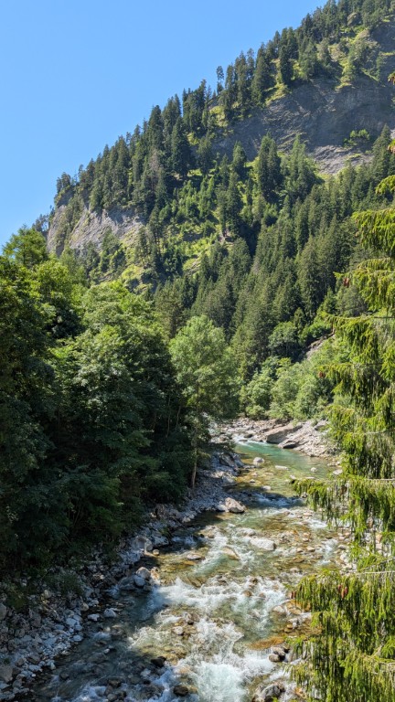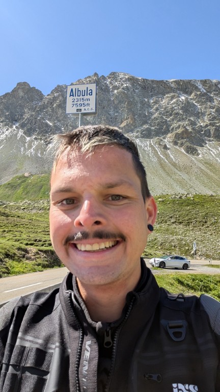 Vom Flüela ging es weiter zum Albulapass – ein Pass mit einer engen Straße. Am Anfang wies ein Schild darauf hin, dass das Fahrzeug nicht breiter als 2,10 Meter sein sollte. Prompt kam mir nach ein paar Metern ein riesiges Wohnmobil entgegen. Doch das war noch nicht alles: Fast oben angekommen sah ich Menschen auf der Straße – mehrere nebeneinander, auf seltsamen Rollschuhen. Sie nahmen mit ihren Stöcken viel Platz ein. Oben angekommen entdeckte ich das Begleitfahrzeug. Es handelte sich offenbar um einen Langlaufclub im Sommertraining – auf der normalen Straße. Großartig! Noch immer war es frisch mit zehn Grad, aber perfekt zum Motorrad- und offensichtlich auch Rollschuhfahren.