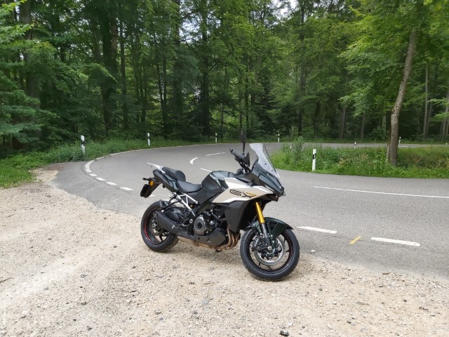Ich wollte die Suzuki GSX S 1000 GX richtig testen und entschied mich für eine Strecke, die ich schon länger nicht mehr fuhr. Von Röschenz aus ging es über den Challpass am Aussichtspunkt aus dem Weltkrieg vorbei nach Dornach. Von da aus fuhr ich über den Gempen, um dann wieder ins beheimatete Schwarzbubenland zu gelangen. An dieser Stelle ist zu erwähnen, dass diese Strecke nicht bei bestem Wetter und am Wochenende zu fahren ist. Denn dann hat es zu viele die dafür verantwortlich sind, dass man die Gegend ausgiebig geniessen kann. Ich spreche nicht nur von Fahrradfahrer*innen. Die Strecke ist an einem ruhigen Tag jedoch super, um auf dem Motorrad abzuschalten oder eben eine Suzuki GSX S 1000 GX zu testen. Und dies funktionierte ganz gut. Ich fühlte mich sehr sicher und jede Kurve war ein Genuss, auch wenn man zu schnell oder zu langsam eine Kurve startete. Aber auch in zügigen Kurven mit etwas erhöhter Geschwindigkeit blieb das Motorrad angenehm hart und fing nicht an zu schwingen. Der Quickshifter ist viel feiner als bei den 800er Modellen, was die Ganze fahrt noch angenehmer machte. Der Klang der Suzuki GSX S 1000 GX macht die Fahr zu einem zusätzlichen Erlebnis. Man fährt keinen Staubsauger aber auch kein Motorrad, das durch den Klang irgendetwas kompensieren muss, einfach hörbar schön. Ja dieses Motorrad gehört ebenfalls zu den Motorrädern, die man ungern in der Garage abstellt.