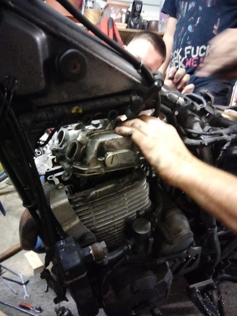 Jetzt mussten der Zylinder und der Ventildeckel von der alten Dichtmasse bereinigt werden. Es gibt an dieser Stelle keine herkömmliche Dichtung, anstelle dessen wird eine Dichtmasse angebracht. Die alte Dichtmasse entfernte ich mit 120er Schleifpapier. Nachdem alle Stellen frei von der alten Dichtmasse waren, reinigte ich sie mit Bremsreiniger. Die Dichtmasse bringt man in Form einer kleinen Wurst an und wird dann mit dem Finger verteillt. Der Finger sollte innerhalb eines Handschuhes sein! Soviel dass sie sich auf der Fläche verteilt aber nicht bis in den Motor eindringen kann. Bei der Montage, muss man dann darauf achten, dass man die Dichtmasse nicht verschmiert. Dies wurde von einem Profi erklärt und begleitet, herzlichen Dank Martin!! Dieser Profi fischte danna uch die schon lange vermisste Bit aus dem Kerzensteckerloch.