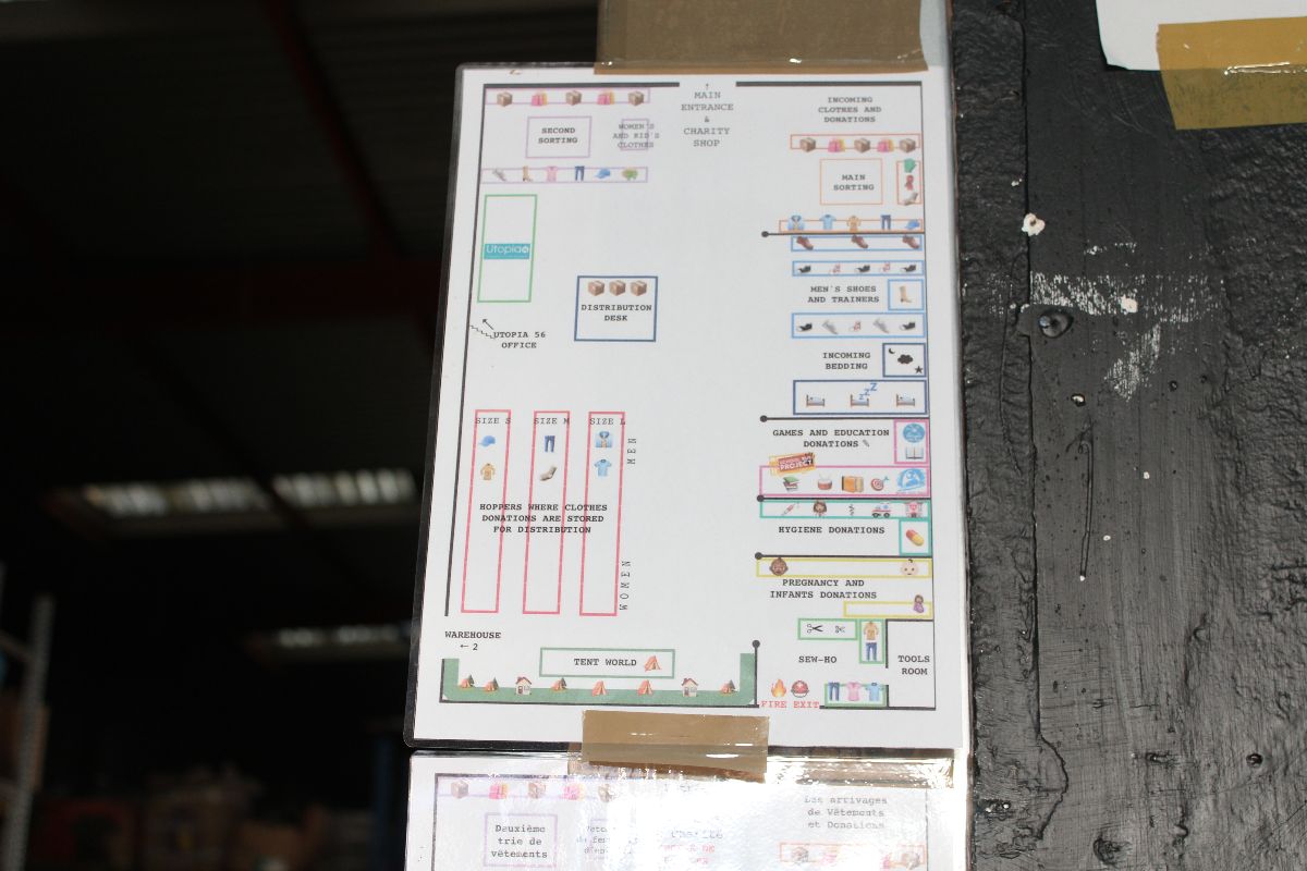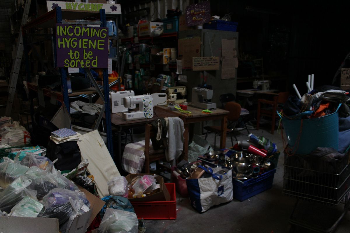 Das Hauptquartier besteht aus einer riesigen Lagerhalle. darin wird zum einen für die 1200 Flüchtlinge gekocht. Vegetarisch, so dass es alle essen können. Wir haben das selbe bekommen. Ich bin ja überhaupt kein Freund von fleischloser Kost, aber das Essen war richtig gut. Zum anderen werden sämtliche Spenden sortiert, geflickt, verpackt und vorbereitet. Das geht von Kleidungsstücken, Hygieneartikel bis zu Zelten, die zum Beispiel letzte Woche von einem festival in England gekommen sind.