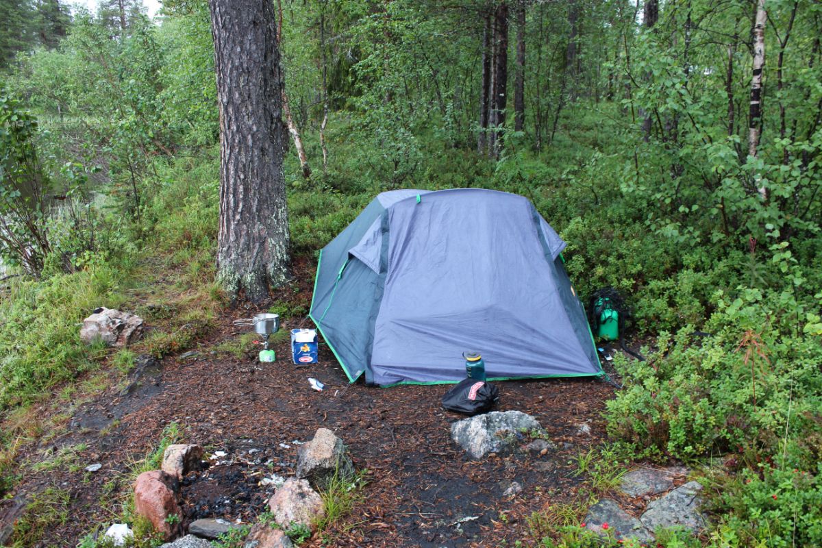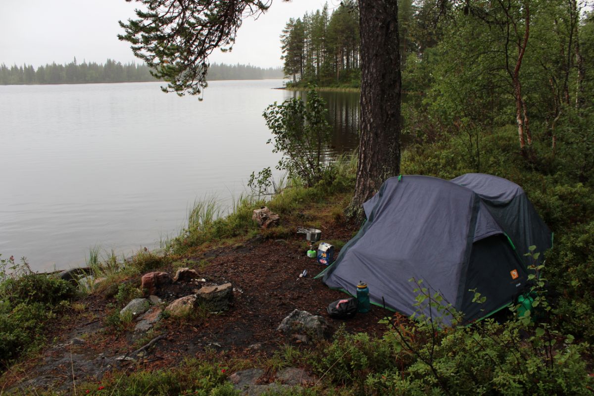 Ich kann mich endlich an kleinenSachen freuen. Zum Beispiel die Spanier die ich mehrmals Kreuze und mich immer mit einem breiten Grinsen überholen und Grüssen. Oder plötzlich war die Strasse offen und ich musste mit Strassenpneus durch nasses grobes Kies und ich bin nicht hingefallen. Das macht einfach freude. An diesemTag regnete es das erste Mal und ich fand keinen Campingplatz mehr, denn in Nordschweden ist es nicht mehr so dicht besiedelt. Also durfte ich das erste Mal Wildcampen, denn hier oben war es genügend nass dachte ich mir. Bei Regen wurde dann das Zelt aufgebaut und gekocht. Als ich mit allem Fertig war, war auch der regen vorüber. Ich hatte wiederum einen Platz an einem See gefunden, einfach unbeschreiblich diese Stimmung in Mitten der Natur, geil. Ich kam an diesem Tag auch das erste Mal mit anderen motorradfahrern ins Gespräch, das macht sehr viel aus wenn man den ganzen Tag alleine auf dem motorrad sitzt.