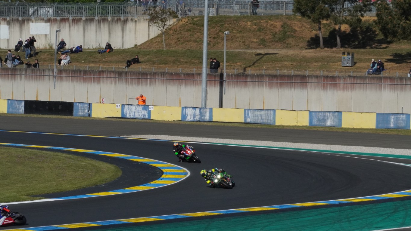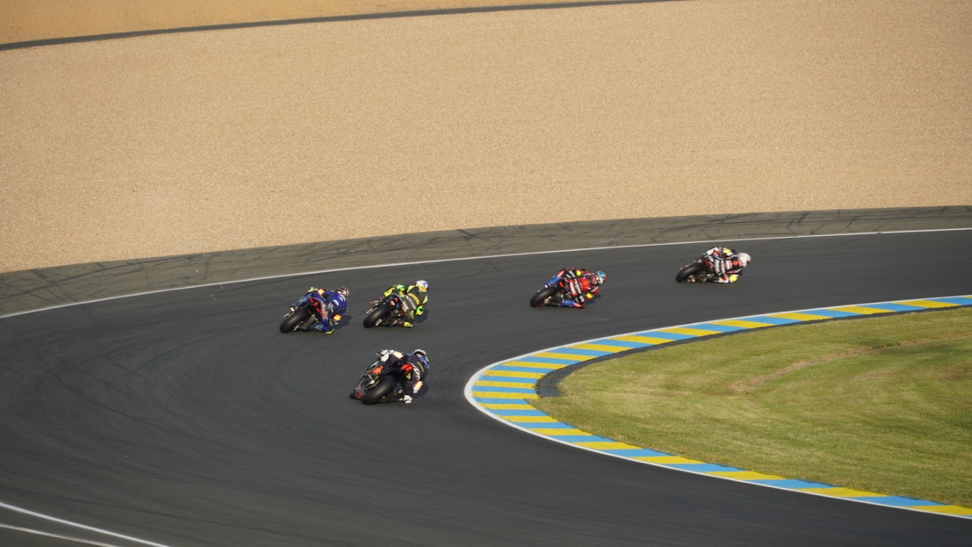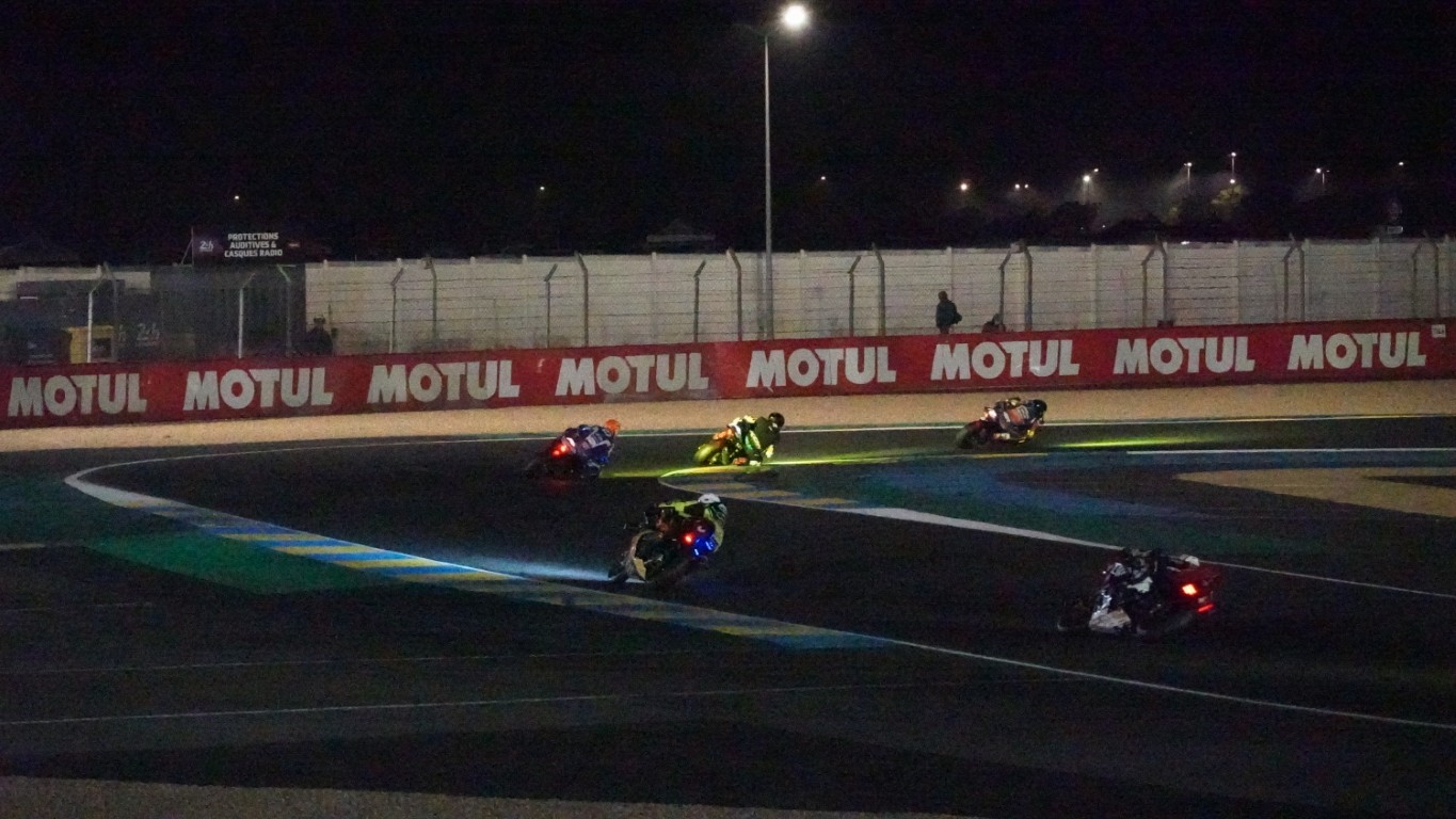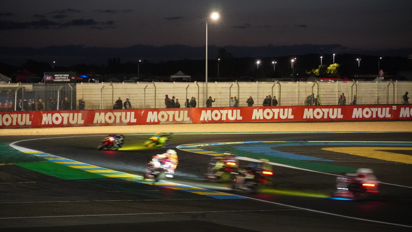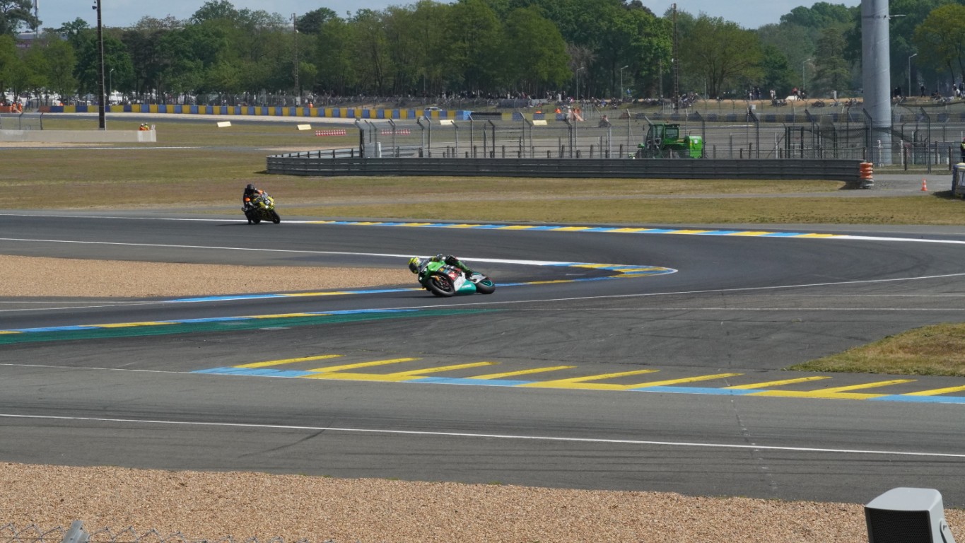 Dann kamen die Securitys und ich musste die Startaufstellung verlassen. Mirko, der Social-Media-Verantwortliche vom Team Bolliger, fragte mich, ob ich mit ihm zur ersten Kurve komme, um den Start anzusehen. Ich freute mich und ging mit. Oben angekommen, genossen wir die französische Nationalhymne, die mit viel Herzblut gesungen wurde und überall auf der Rennstrecke zu hören und zu spüren war. Dann ging es schon los und die 60 Motorräder bretterten an uns vorbei. Eindrücklich, aber leider habe ich den legendären Le-Mans-Start so verpasst. Wir wechselten noch ein paar Mal die Position und machten unsere Aufnahmen. Alex ist der Start geglückt, er fuhr von Startplatz 14 auf 10. Nach 20 Minuten wurden dann schon die ersten überrundet. Ich wollte nicht zu lange draussen an der Strecke bleiben, denn ich wollte beim ersten Fahrerwechsel und Boxenstopp dabei sein.