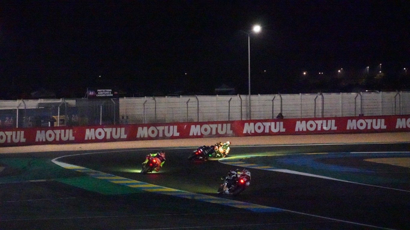 Bis kurz vor 18 Uhr verbrachte ich die Zeit in der Box. Der erste Kaffee wurde verschlungen, wie viele es wohl noch werden? Dann kam Michèle von Kawasaki Schweiz zu mir, wir kennen uns von den vergangenen Kawasaki-Tests. Sie meinte, sie können noch in ein paar andere Boxen reinschauen, ob ich mit wollte. Ich sagte natürlich gleich zu und so zogen wir los. Zuerst gingen wir zu Yart, dem späteren Gewinner des 24-Stunden-Rennens in Le Mans. Eine ganz andere Box als bei Bolliger, aber nicht weniger ordentlich oder organisiert. Es war auch eine Ruhe zu spüren, man merkte, die wissen, was sie machen. Wir warteten den Boxenstopp ab und gingen dann weiter zu Kawasaki Webike Trickstar. Es ist das Kawasaki-Werksteam und das einzige Team, das mit der neuen ZX-10R an den Start ging, was an den Winglets einfach zu erkennen war. Auch diese Box sah wieder ganz anders aus, wenn auch nicht etwas chaotischer. Trotzdem reichte es am Schluss für den dritten Rang. Michèle nahm mich dann noch mit zum Kingtyre Fullgas Racing Team, auch ein Kawasaki-Team. Hier waren wir aber nicht nur wegen dem Einblick in die Box, dazu später. Denn hier sahen wir einen etwas anderen Boxenstopp, das Team hatte kein Schnellwechselteam wie zum Beispiel das Team Bolliger und musste bei jedem Boxenstopp die Kette neu «einfädeln». Und genau das dauerte etwas mehr Zeit.
