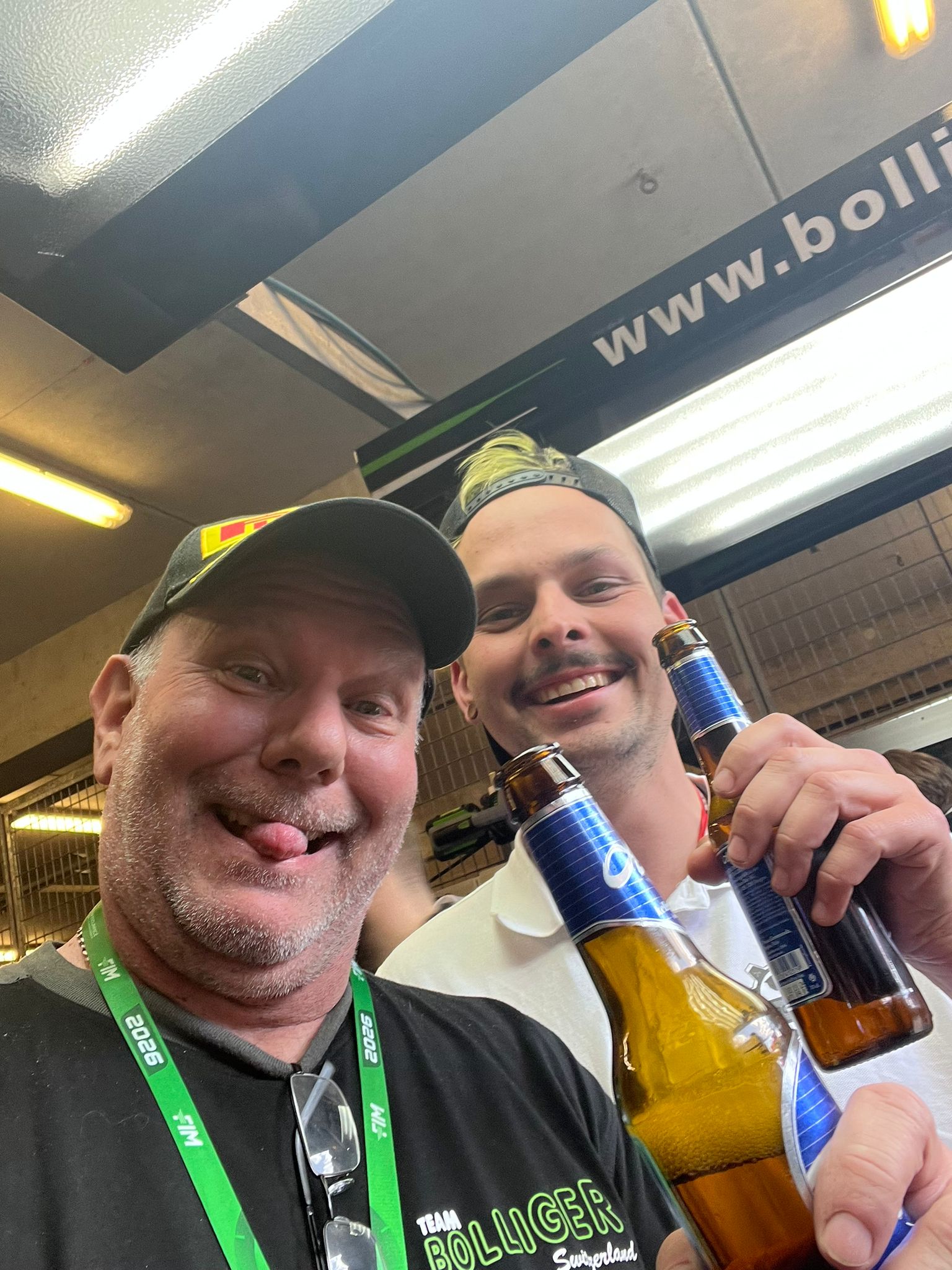 Dann war 15 Uhr und wir rannten alle auf die Boxenmauer, um die Fahrer jubelnd im Ziel zu begrüssen. Freunde, da waren bei mir alle Dämme gebrochen, meine Knie zitterten und die Tränen flossen und ich konnte mich schlecht beruhigen. Es half auch nicht, als sich alle in den Armen lagen. Wir waren auf dem gesamten 7. und in unserer Klasse auf dem 6. Rang ins Ziel gefahren. Das bedeutet 30 Runden hinter dem Gewinner Yart, 829 gefahrene Runden und 27 Pitstopps, die gesamthaft 51 Minuten und 15 Sekunden dauerten. Das Ergebnis war aber in diesem Moment Nebensache, wir freuten uns einfach, dass wir es geschafft hatten. Die Motorräder kamen nach der Auslaufrunde zurück in die Box und es gab den einen oder anderen Burnout. In der vergangenen Woche fragte ich mich immer wieder: Wieso macht man diesen ganzen Aufwand? Bei der Zieleinfahrt wurde es mir zum wiederholten Male bewusst, wieso. Als ich mich etwas beruhigte, ging ich in die Box, da umarmte man sich und stiess mit Aarebier an und es gab wie so oft einen Schnupf, aber dieser war ganz besonders. Bald merkte ich, ich war nicht der Einzige, der Tränen in den Augen hatte. Auch Lüschi war sichtlich gerührt und meinte gutmütig: «Weisch Luki, das muäsch eiifach usä laah, das isch doch öbis schöns».