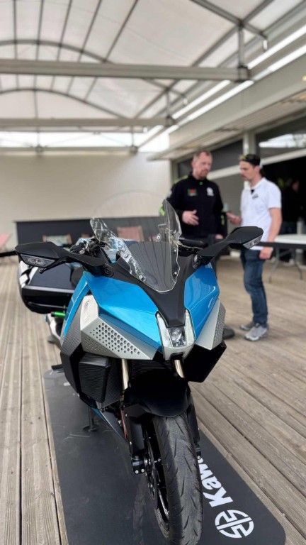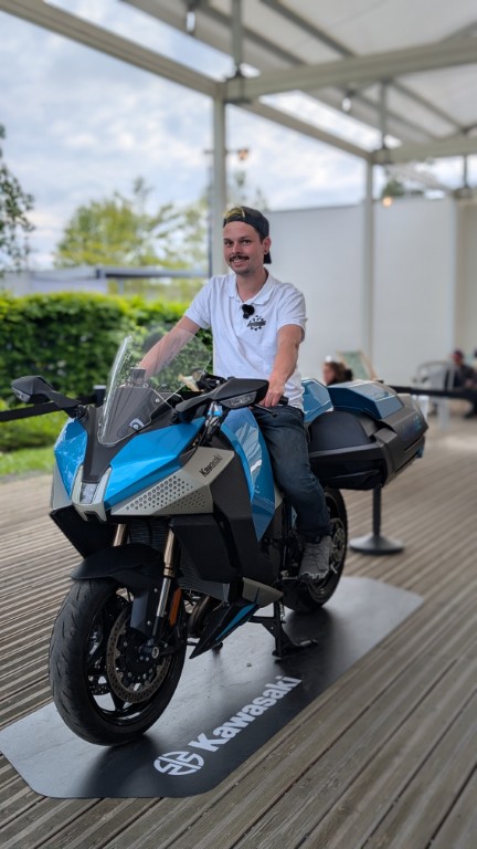 Nach dem Boxenstopp beim Kingtyre Fullgas Racing Team kam der eine Mechaniker, Jannick Kaufmann, zu Michèle, die beiden kannten sich und er war der Grund für unseren Besuch. Im Rahmen vom 24h-Rennen in Le Mans wurde ein Wasserstoff-Motorrad von Kawasaki ausgestellt. Von dieser Maschine gibt es genau zwei, eine in Europa und eine in Japan. Dieses Wasserstoffmotorrad dürfen hier in Europa genau zwei Menschen fahren und einer davon ist Jannick Kaufmann vom Kingtyre Fullgas Racing Team. Ich hatte wieder einmal unglaubliches Glück. Jannick hatte Zeit, wir gingen zum Wasserstoffmotorrad von Kawasaki und er beantwortete mir ein paar Fragen zu diesem Motorrad. Das war richtig spannend.