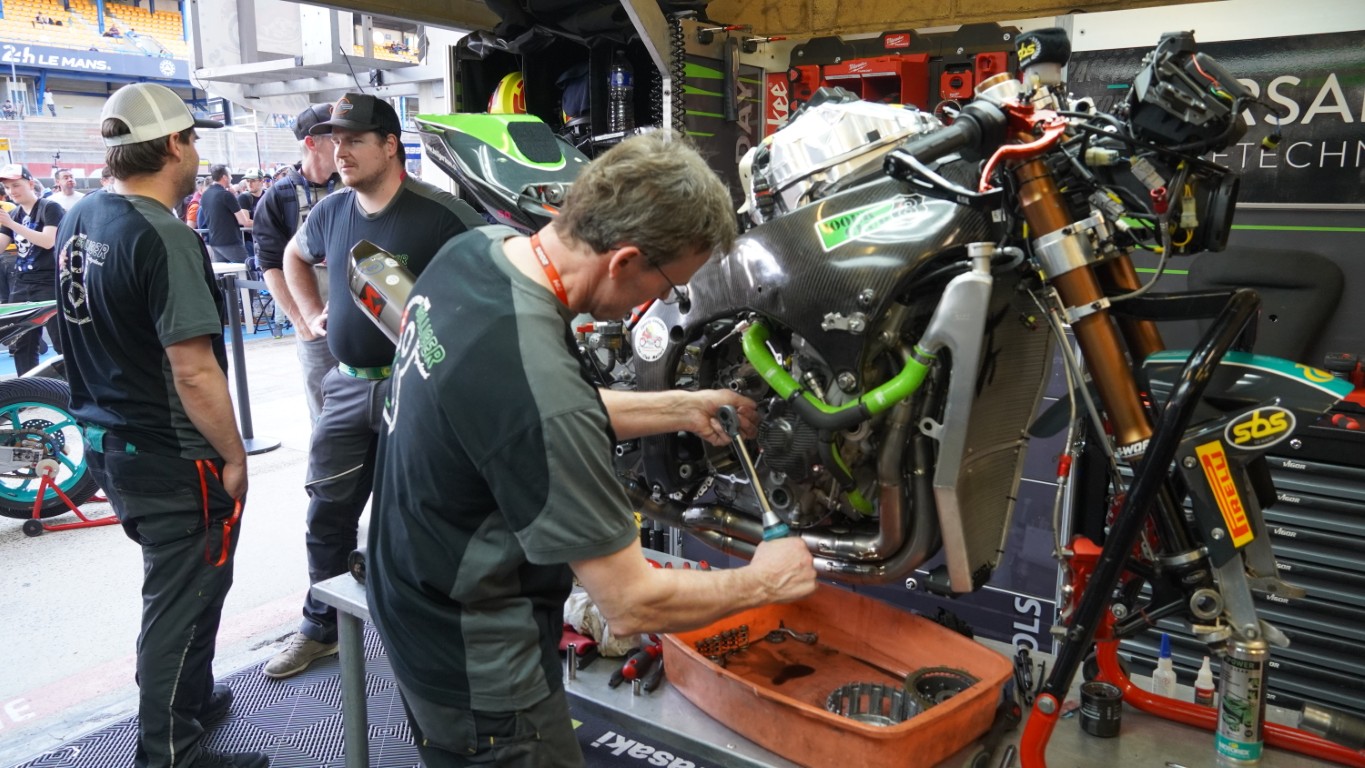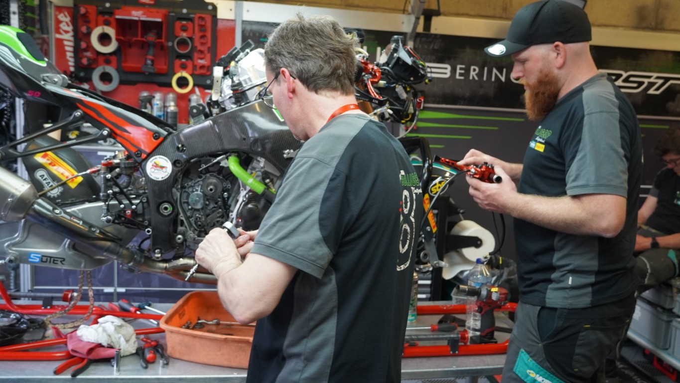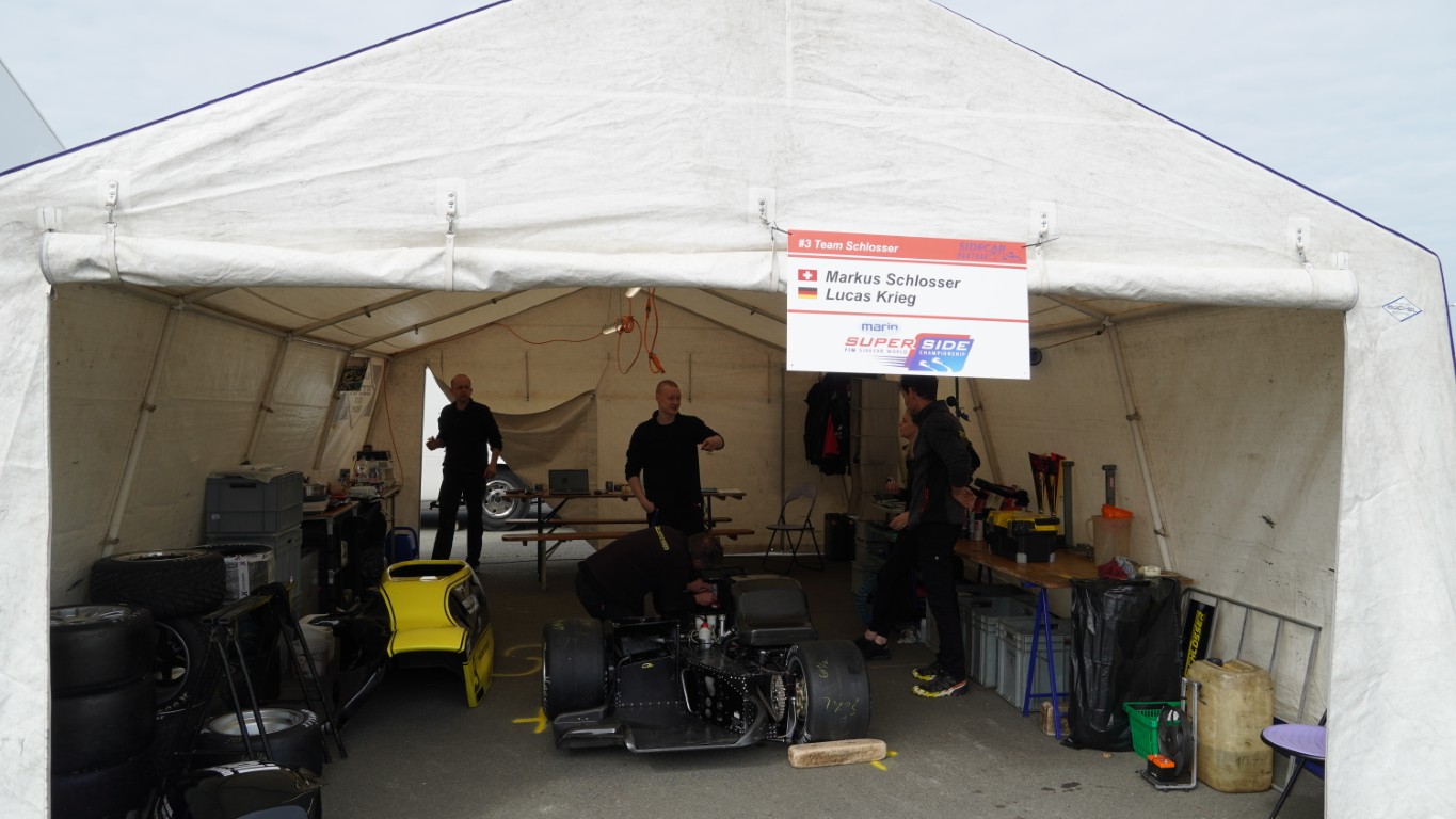 Nachdem der mittlerweile kalte Kaffee getrunken war, machte ich mich auf den Weg ins Fahrerlager der Fahrer mit einer Gehbeeinträchtigung. Kevin zeigte mir auf dem Lageplan, wo sich dieses befinden sollte. Dort angekommen fand ich aber etwas ganz anderes vor: das Fahrerlager der Seitenwagen. Da freute ich mich. Ich schaute in jedes einzelne Zelt der Teams und beobachtete sie beim Schrauben. Währenddessen überlegte ich mir Fragen auf Englisch und Französisch, denn ich wollte eines der Teams ansprechen und mehr erfahren. Wie es der Zufall wollte, benötigte ich die englischen und französischen Fragen nicht, denn eines der letzten Teams im Fahrerlager war ein Schweizer Team, das Team Schlosser.