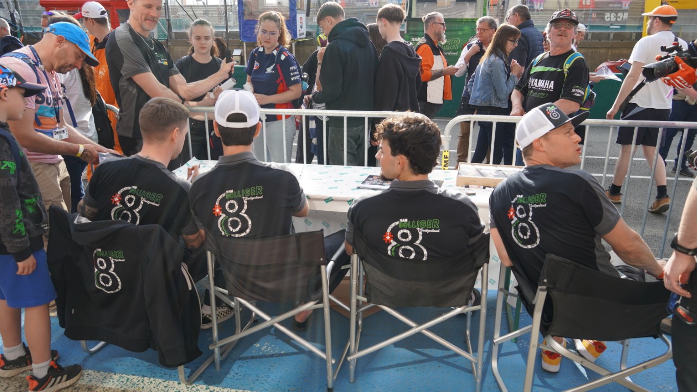 Nach diesem unvergesslichen Erlebnis wollte ich unbedingt einen solchen Fahrer kennenlernen. Ich nahm einen Kaffee mit, um auf dem Weg dorthin auf einer mir noch unbekannten Tribüne meine obligate Kaffeepause zu geniessen. Ich fand eine, wo ich ganz nah an der Strecke sass. Während ich hier alleine mit meinem Kaffee sass und die Motorräder an mir vorbeischossen, wurde mir wieder einmal klar, was ich hier gerade erleben darf. Das ist kein MotoGP-Rennen, bei dem ich Fahrer sehe, die ich nur vom Fernseher kenne. Hier fahren Nico, Kylian, Alex und Ville mit, die ich seit bald fünf Tagen begleite und mit denen ich die Tage verbringe. Ich darf diesen Sport hautnah erleben, wie es viele ihr ganzes Leben lang nie erleben können. Das ist einfach toll und ich musste die eine oder andere Freudenträne wegwischen. Danke Kevin und danke an das Team Bolliger.