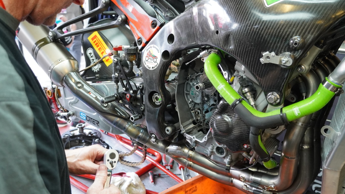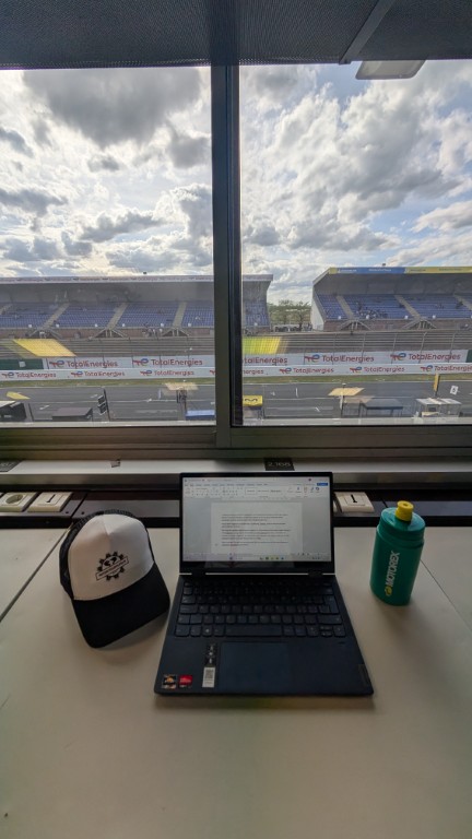 In der Zeit, in der ich nicht wirklich vorwärtskomme, machen die Mechaniker grosse Fortschritte. Sie bereiten das Rennmotorrad für morgen vor. Neue Kupplung, neuer Kühler, neuer Auspuff und das Getriebe wird geöffnet und kontrolliert. Das Ganze sollte vor dem Pitwalk, bei dem alle Zuschauer in die Boxengasse kommen dürfen, fertig sein. Und das war es auch. Wenig überraschend nach dem, was ich hier alles erlebt habe. Da die Box immer voller wird mit Besuchern und ich noch diesen Text schreiben wollte verzog ich mich in das Media Center und schaut mal welchen Ausblick ich hatte(letztes Bild).