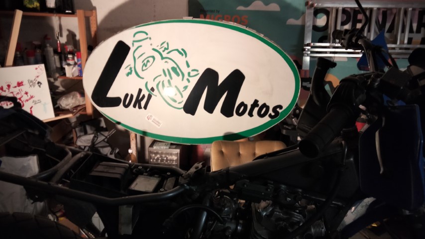 Vor circa einem Jahr schloss Luki seine Werkstatt für immer. Jedes Mal, wenn ich bei seiner geschlossenen Werkstatt vorbeifuhr, sah ich das Schild an der Hauptstrasse stehen. Ich dachte darüber nach ihn anzurufen, ob er das Schild noch brauche, denn auch ich heisse Luki und liebe Motos. Anscheinend dachte ich auch laut darüber nach. Irgendwann vergass ich jedoch diesen Gedanken. Bis zu meinem 30. Geburtstag, ja den hab ich auch schon hiter mir. Die Frau meines Cousins kam rein und meinte, ich soll mal raus kommen. Draussen konnte ich meinen Augen nicht trauen, inmitten meiner Freunde stand das Schild von Luki Motos, ei hatte ich eine Freude. Noch heute muss ich grinsen, wenn ich daran denke, dass das Schild von Luki bei mir in der Garage steht. Danke an alle Freunde, Familienmitgleider und liebe Menschen die das möglich gemacht hatten, dankä vielmol!!