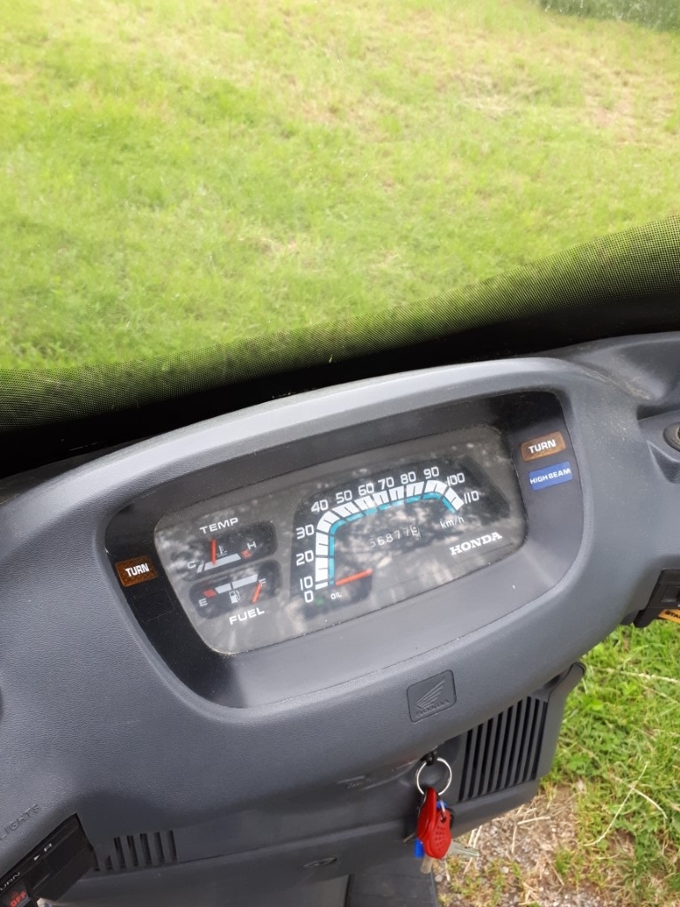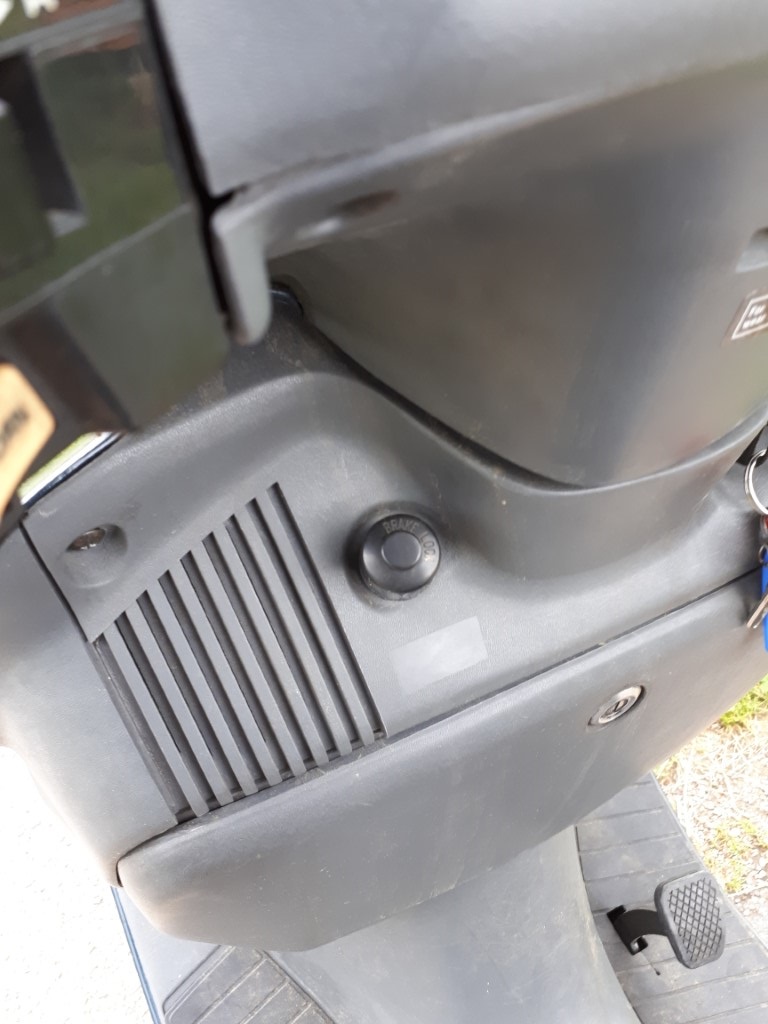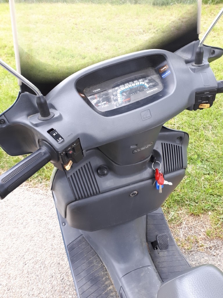 Der Name ist Programm, es fühlt sich richtig spacy an wenn man mit dem Hobel unterwegs ist. Das Ding hat eine Fussbremse und eine Handbremse wie beim Motorrad. Dank dem Schweizer Paragrafenreiterverbund hat das Ding auch eine Feststellbremse(im zweiten Bild zu sehen), musste damals so nachgerüstet werden. Die Honda Spacy hat 125 ccm, 110kg Leergewicht und eine Leistung von 7.4kW/10Ps.