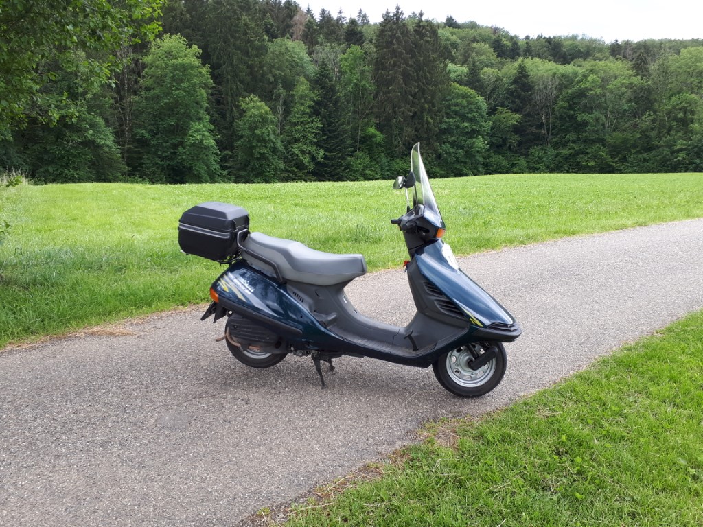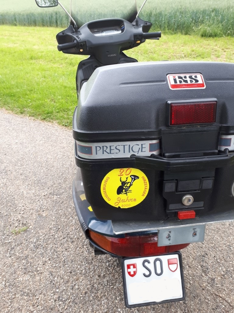 Die Box hinten drauf sieht scheisse aus, ich weiss. Aber es gibt zwei sehr schwerwiegende Gründe wieso ich sie noch nicht demontiert habe. Erstens, der Notfallhammer, falls die Zündbox doch nicht will, habe ich den Hammer immer zur Hand. Zweitens, auf der Box hat es einen wunderschönen 20 Jahre Jubiläums-Kleber von der Guggenmusik(für nicht Schweizer, das ist eine Karnevalsmusikgruppe), in der ich mitspiele. Dieses Jahr haben wir das 40 jährige Jubiläum gefeiert. Und deshalb bleibt die Box auf dem Spacy drauf. Und nun ein paar wunderschöne Bilder meiner neuen Wegbegleiterin.