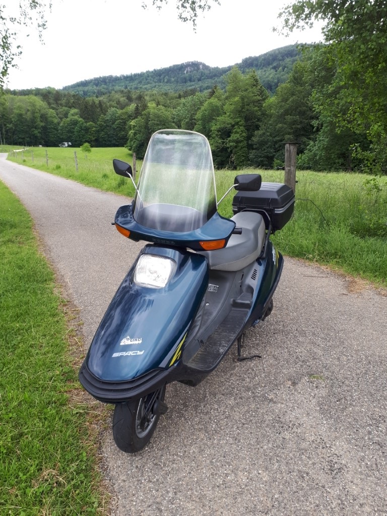 Ein Kollege, vor Jahren mal auf diesem Blog als Suzuki Bandit aufgetreten, hat, wie so viele Menschen, einen Vater. So weit so gut. Dieser Vater hatte eine Honda Spacy 125. Diese wurde nicht mehr so oft gebraucht und brauchte etwas Liebe zum starten. Aus diesem Grund wollte er sie entsorgen. Ich mit meinem sozialen Hintergrund, habe mich natürlich sofort gemeldet und das gute Stück bei mir aufgenommen. Sie sieht ganz gut aus und macht richtig Spass. Ihr Problem ist, dass man zum Starten erstmals mit dem Hammer auf die Zündbox schlagen muss, dies wurde mir so erklärt. Und das war dann auch so. Ich nehme an, dass da irgendwelche Relais drin sind, die hängen bleiben. Aus diesem Grund habe ich eine neue Zündbox bestellt und nun läuft der Hobel wieder einwandfrei.