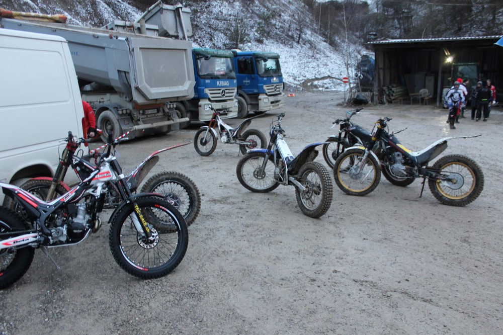 Nach einem Durchgang war meine Stimmung etwa so wie mein Trial ausgesehen hat, am Arsch, es war sau kalt und ich habe den gefrorenen Boden schon mhermals näher angeschaut. Ich dachte war eine coole Erfahrung aber jetzt brauch ich ein kühles Bier. Denkste, das macht man jeweils drei Mal. So hatte ich die Chance einige Passagen doch noch auf dem Motorrad und mit dem Motorrad zusammen zu fahren. Bis am Ende sahen wir, ich und mein Trial, Gasgas txt 280, waren am Ende völlig am Arsch und waren froh aber auch zufrieden als es endlich Feierabend gab.
