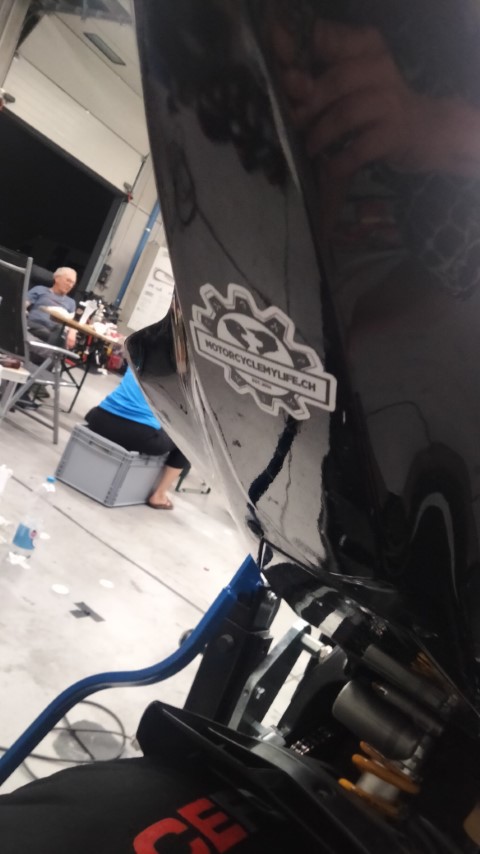 Am nächsten Tag ging es schon früh los, denn es gibt, das wusste ich bis dahin auch nicht, Motorräder die zwei Stunden warm laufen müssen. Trainingsstart war um 9 Uhr, um sieben war man somit wach. Aber ich muss zugeben, ich konnte es kaum erwarten, all die Motorräder in Aktion zu sehen. Beim begutachten von Thomis R6 viel mir was sehr interessante Werbung auf.