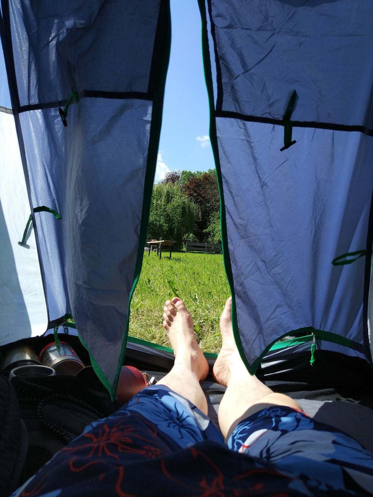 Am nächsten Tag wurde ich mit sanftem rütteln am Zelt zum Morgenessen gerufen. Seit dem ende meiner grossen Reise habe ich nie mehr so gut geschlafen wie in dieser und der darauf folgenden Nacht. Wenn man schon geweckt wird, muss man dann aber auch mal den wohligen Schlafsack verlassen. Kurze Hosen und Kapuzenpulli anziehen, Socken loswerden und los gehts. Barfuss durch die noch feuchte Wiese und im Gesicht die ersten Sonnenstrahlen zu fühlen, einfach schön. Wobei die doch nicht soo sanften Sonnenstrahlen sieht man jetzt noch meinem Gesicht an. Am Morgentisch gab es Brot und heissen Kaffee. Ich musste ihn nicht mal selber Kochen. Ich lernte noch die anderen Organisatoren kennen und fühlte mich schon bald pudelwohl.