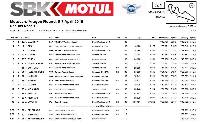 Gestern Samstag fand das erste Superbike Rennen in Aragon statt. Bautista(Ducati) startete neben Tom Sykes(BMW) und Sandro Corstese(Yamaha). Reitenbergers(BMW) Rennen war nur einige wenige Meter lang er stürzte gleich beim Start. Davies(Ducati), Rea(Kawasaki) und Lowes(Yamaha) kämpten hinter Bautista um die zwei verbleibbenden Podestplätze. Schlussendlich gewann Bautista mit 15.1 Sekunden vor Rea und Davies. Cortese der auf Platz drei startete landete schlussendlich auf Platz sieben.