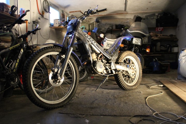 Kurz vor dem Feierabend fuhr ich dann in Richtung dieses Hanges, in meinen Erinnerungen ein Steilhang. Oben schaltete ich in den ersten Gang runter, bog in den Hang und liess die Kupplung langsam los, das hätte es jedoch nicht gebraucht denn ich war nicht im 1. sondern im neutralen Gang. Das Motorrad wurde immer schneller, die Dornenstauden links und rechts schossen nur so an mir vorbei. Irgendwann stürzte ich, das Motorrad rutschte den Hang hinunter und ich hing in den Dornen. Das Motorrad hat den Sturz gut weggesteckt, ich sah aus als hätte mich ein Puma angegriffen. Nach einem Feierabendbier und einer Cervelat machten wir uns bereit für die Heimfahrt. Schon während dem Feierabendbier wurde mir das Trial, dass ich probe gefahren bin, angepriesen. Ich lehnte aus Vernunft ab. Als wir dann im Auto sassen und ich nochmals darauf aufmerksam gemacht wurde welch ein Schnäppchen es wäre und wie viel Platz es im Auto noch gäbe, entschied ich mich gegen meine Vernunft. Wir stiegen aus und wir luden das Trial in unseren Transporter ein.