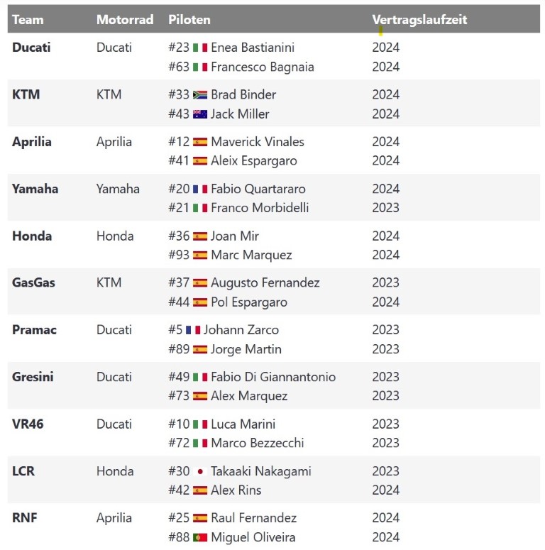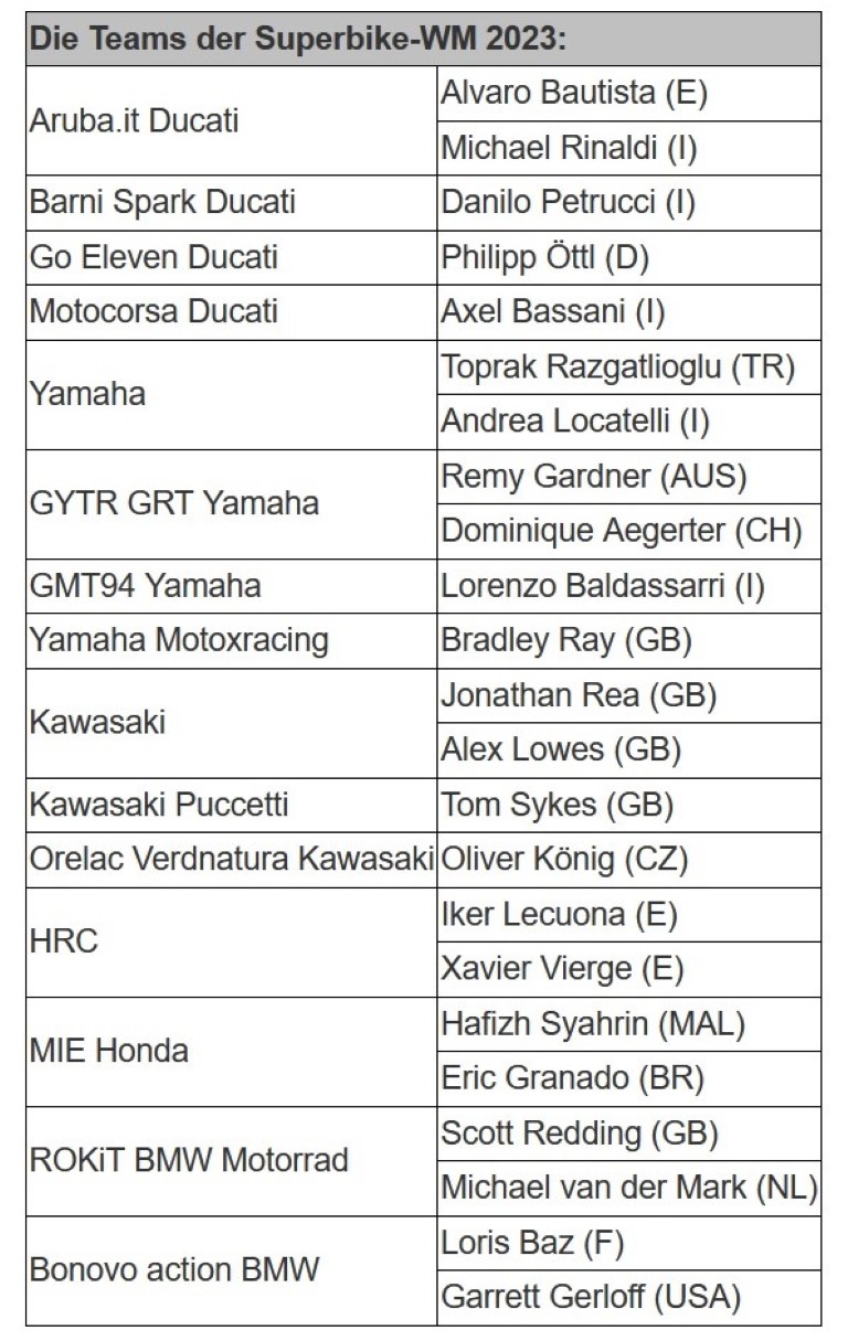 Aber wer fährt denn eigentlich wo und wie viele? In der Superbike gibt es 3 Teams mehr wie in der MotoGP. In der MotoGP fahren 12 Teams, 5 Werks und 7 Kundenteams, um den Weltmeistertitel. In der Superbike sind es 15 Teams. In der Superbike fällt Aprilia und KTM als Marke weg, dafür kommen BMW und Kawasaki dazu. In der MotoGP gibt es in jedem Team zwei Stammfahrer, dies ist in der Superbike nicht immer der Fall. 7 der 15 Teams haben nur einen Stammfahrer.