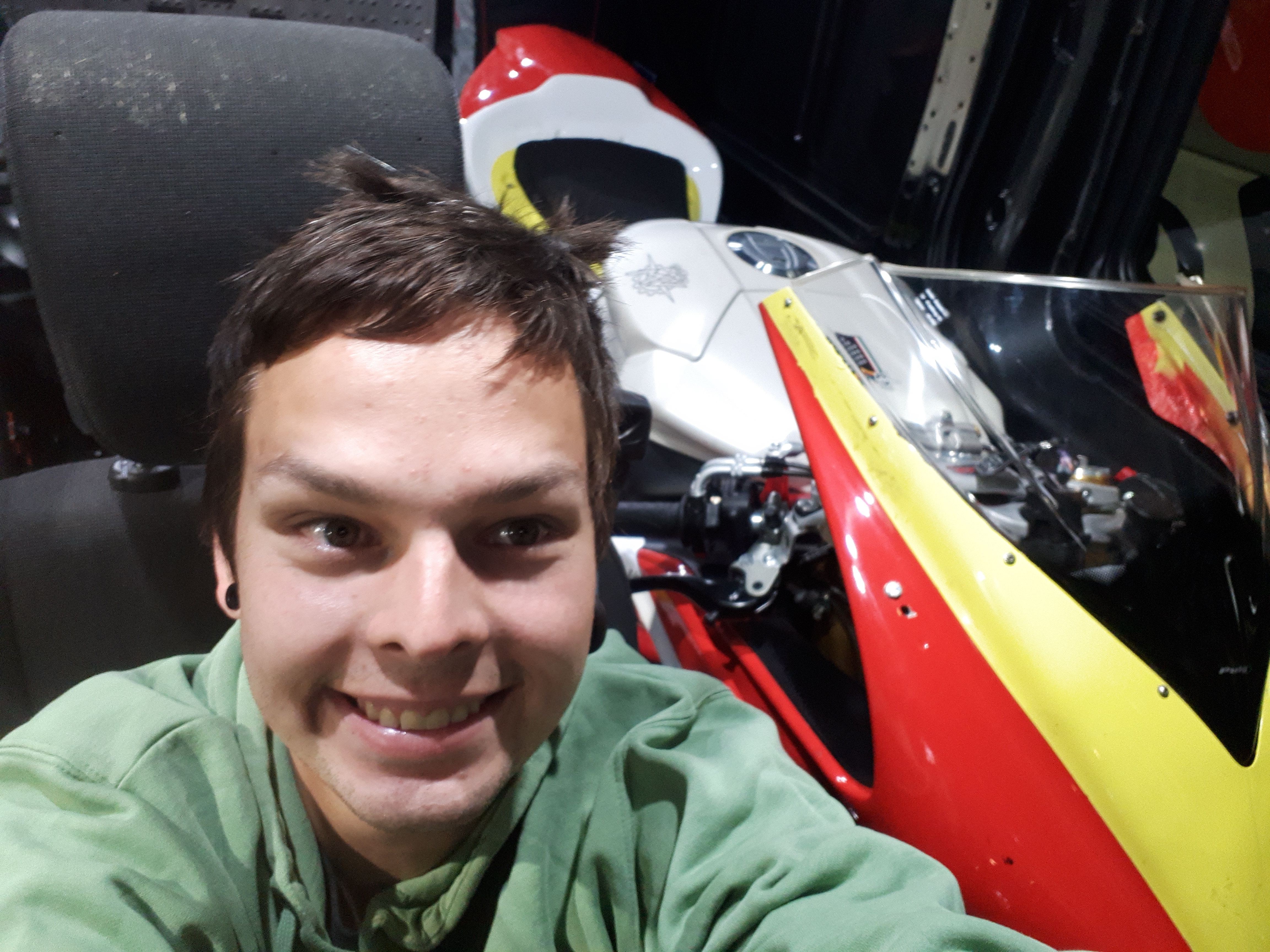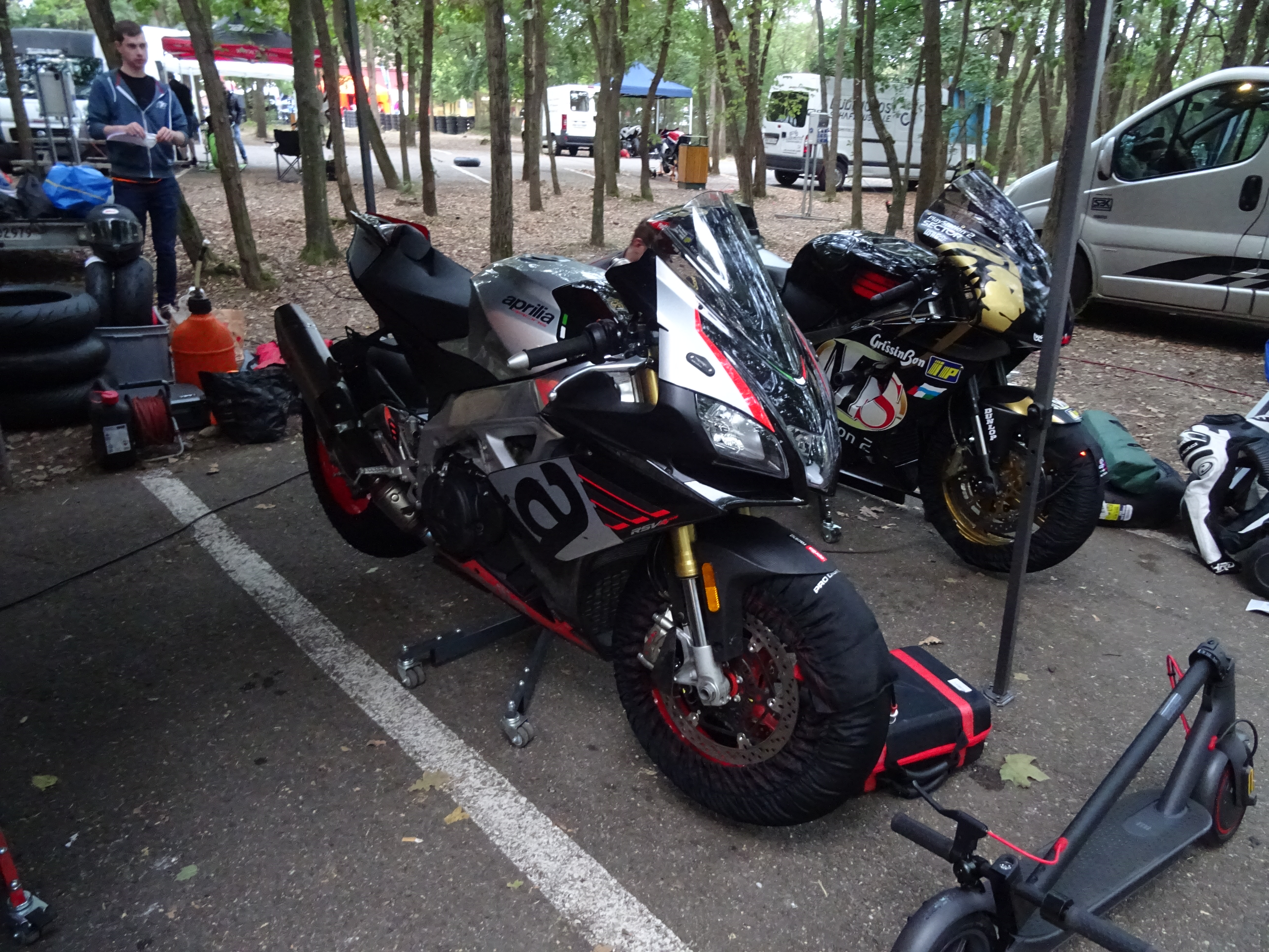 Die erste Gruppe die am Morgen auf die Strecke ging waren die Schnellen. Zwei Freunde waren mit je einer Aprilia mit dabei. Es wurden immer Turns von 20 Minuten gefahren. Leider fuhr die erste Aprilia schon nach zehn Minuten raus. Eine Aprilia RSV4 RR. In diesem Fall stand das RR für "rassel rassel". Eine Ventilfeder ist gebrochen. Dies war zum Glück die einzige Panne. Er durfte dann den Rest vom Tag auf der Streetfighter verbringen.
