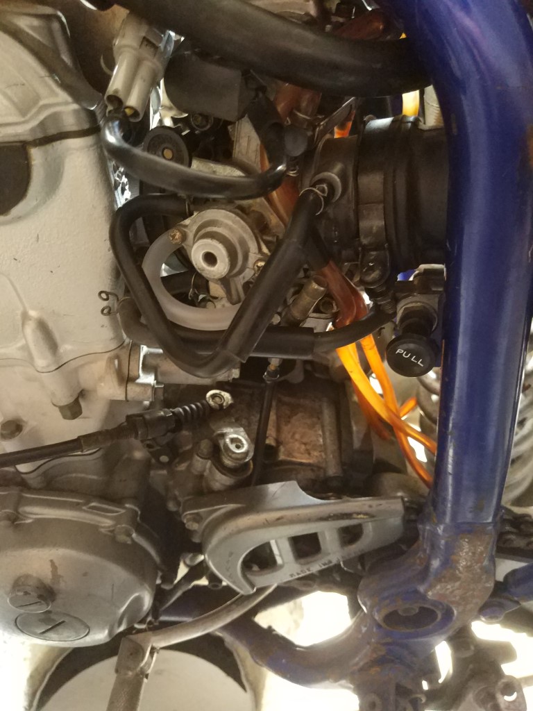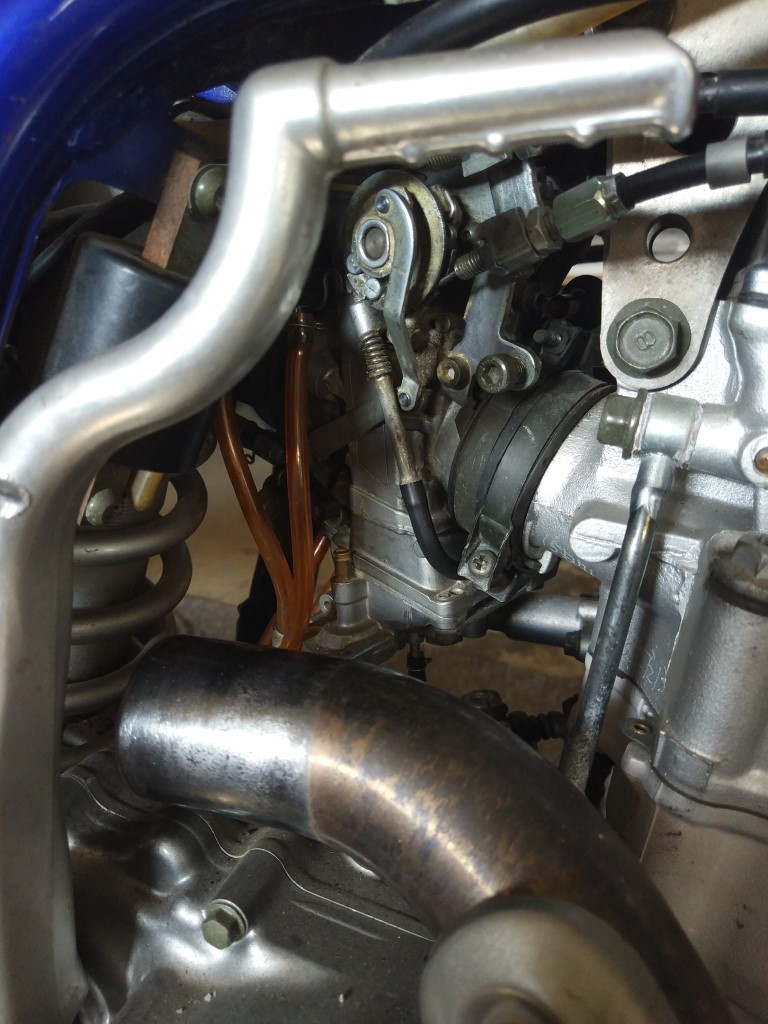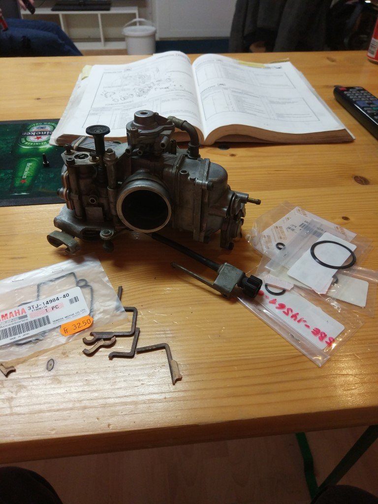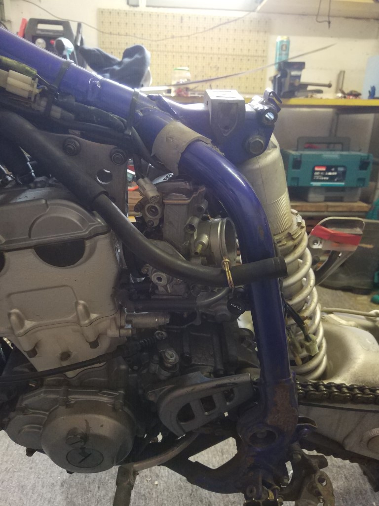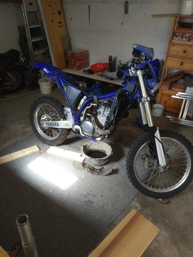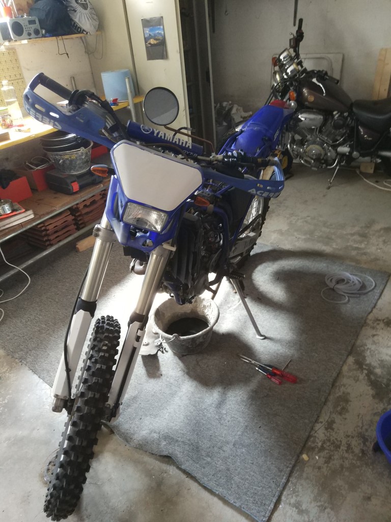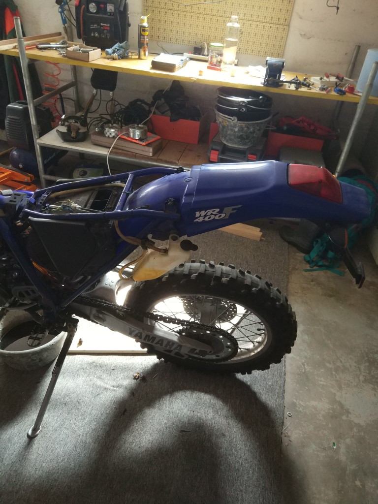 Es ist eine WR 400 F, Baujahr 2001. Sie ist mit Crossrädern aber auch mit Sumorädern ausgestattet. Als sie hier ankam sah sie arg mitgenommen aus. Die Verschalung war völlig ausgebleicht, sogar stellenweise bröckelig, und der Rahmen hatte Teilweise oberflächlichen Rost. Da sie nicht anlief, habe ich mich dazu entschieden den Vergaser zu demontieren und zu reinigen. Es wurden auch sämtliche Dichtungen ersetzt. Jetzt haben wir sie wieder zusammengebaut. Das Heck lässt sich sehr einfach, ohne Hammer und Rohrzange, entfernen und montieren. Es müssen nur drei Schrauben gelöst werden. Beim Einbau des Vergasers ist darauf zu achten, dass sämtliche Anbauteile, wie Schläuche und externe Stellschrauben, schon vorher montiert werden, ansonsten macht die ganze Arbeit mehrmals. Nun ist alles soweit wieder montiert und als nächstes steht nun der Ölwechsel an. Das Öl haben wir schon abgelassen und am Donnerstag sollte der benötigte Filter geliefert werden.
