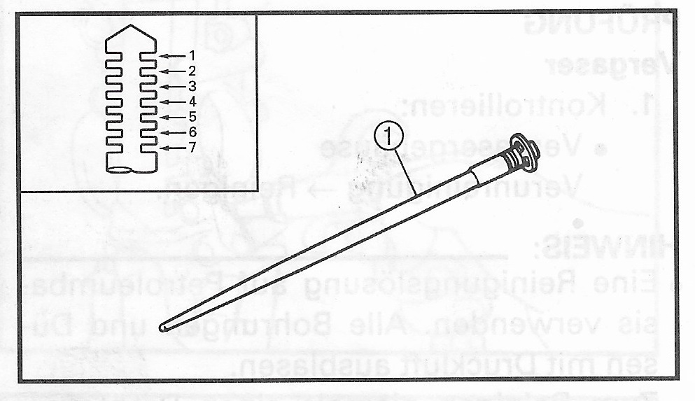 Die Leerlaufgemisch-Regulierschraube ist im Bild ganz rechts(Nr.1) zu sehen. Die ist dann von aussen einstellbar. Bevor wir den Vergaser wieder komplett zusammenbauten, kontrollierten wir noch weitere Bauteile zum Besipeil das Nadelventil. Durch die Position des Nadelventils wird der Nachfluss in die Schwimmerkammer reguliert. Die Position des Nadelventils wird durch das Niveau der Schwimmkammer verstellt. Auf gut Deutsch, das Nadelventil ist ein wichtiges Bauteil in einem Vergaser.