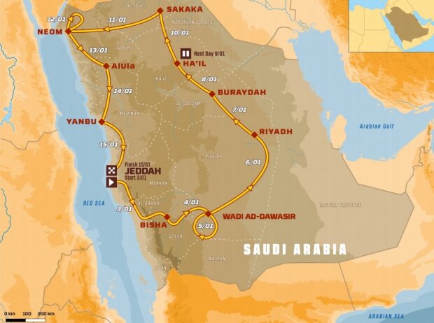 Morgen startet die Rally in Dschidda. In 14 Tagen werden 7646 Kilometer zurück gelegt. Heute Samstag wird ein Prolog von 129km gefahren, davon werden für die morgige Startaufstellung 11km gewertet. Die Dakar Rally ist in 12 unterschiedliche Etappen. Diese Etappen sind zwischen 225 und 813 km lang. Am 9. Januar, zwischen Etappe 6 und 7, gibt es einen Ruhetag.