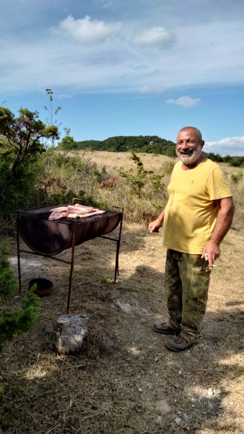 Es wurde langdsam Zeit zum gehen als Marion in ein Gespräch mit ein paar Herren vom Dorf verwickelt wurde. Wir wussten noch nicht um was es ging aber zeigte immer wieder auf sein Fleisch. Als das Gespräch ruhiger wurde, fragte uns Mario ob wir mit den Herren aus der Bar, nicht unbekannte Gesichter, grillieren gehnen wollen. Wir waren sofort dabei. So stiegen wir bei den Herren in die Autos ein und fuhren los. Der Weg wurde immer holpriger, bis eigentlich keiner mehr da war. Unterwegs unterhielt ich mich mit dem Fahrer auf italiensich und Englisch, er beschwerte sich über das Auto, ein Fiat 550, dass er von seiner Mutter ausgeliehen hatte. Dann hielt er plötzlich an, wir befanden uns in einem Wald. Da gab es aber noch ein Wellblechunterstand. Vor dem Wellblechunterstand befand sich ein Grill aus einem halben Ölfass und man hatte eine wunderschöne Aussicht über die Umgebung. Unzählige Hügel, dazwischen sah man Dörfer und Strassen. Es waren die Strassen über die wir gestern nach Serrazzano gefahren sind.