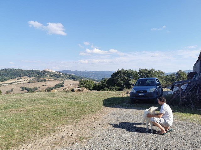 Und so ging der Nachmittag vorüber, bei gutem Wein und Fleisch und mit lustigen Unterhaltungen. Irgendwann meinte Mario, der 80 Schafe hat, er müsse heute doch noch was arbeiten. Wir packten die Gelegenehit und gingen mit, denn ich wollte ubedingt noch auf seinen Hof. So ging es mit dem Renault Kangoo zurück nach Serrazzano und weiter zum Hof von Mario. Meine Freundin im Laderaum und ich durfte mich auf den Beifahrersitz setzen. Auf dem Hof angekommen begrüssten uns die Herdenschutzhunde. Diese sind am Tag sehr friedlich, Nachts weniger, das kann ich euch bestätigen. Einer war jung und war noch nicht so lange bei Mario angestellt. Er hatte Freude daran die Schafe zutreiben und so kam es, dass plötzlich ein Teil der Herde hinter dem Haus und nicht mehr auf der eingezäunten Wiese stand. Veilleicht lag es auch am tiefen Zaun aber dies ist nur eine Hypothese. Unter den Wiesen rund um Marios Hof gibt es wenig Erde auf dem felsigen Untergrund. Deshalb verteillt Mario immer wieder Stroh, dies schützt das vorhandene Grass und es entsteht neue Erde. Dabei halfen wir Mario, wie schon in vergangen Jahren. Wie die Arbeit in meiner Werkstatt, ging auch diese Arbeit bestens in Flipflops.