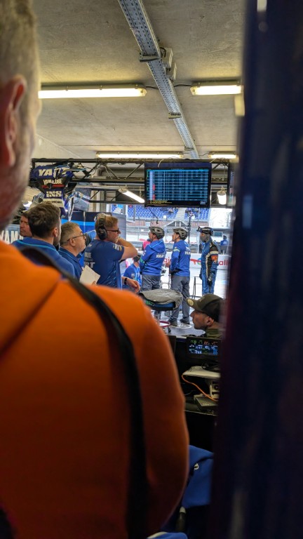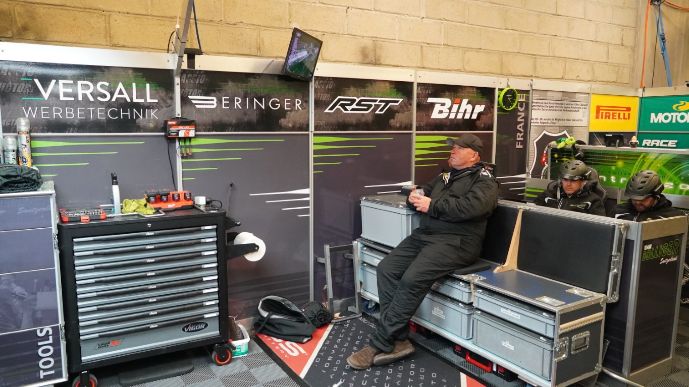 Nun ging alles schnell. Ich war noch zweimal draussen für Fotos. Und dann war schon Mittag und es ging nur noch 3 Stunden. Der Erste hatte zu diesem Zeitpunkt Feierabend, Adi, der Zeitnehmer, denn die arbeiteten in 3-Stunden-Schichten. Sie sind das Verbindungsglied zwischen Fahrer und Box. Über die elektrische Boxentafel, die elektrisch rausfährt, können sie dem Fahrer die Infos aus der Box mitteilen. Der Fahrer kann aber auch anzeigen, wenn er in die Box will, indem er den Fuss rausstreckt. In einem solchen Moment hat dann das Boxenteam eine Runde Zeit, sich vorzubereiten, bevor der Fahrer in die Box fährt.
