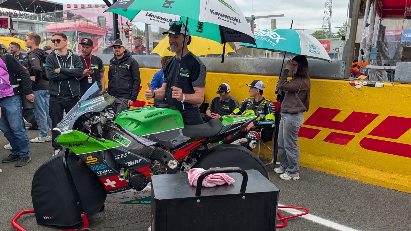 Bis kurz vor 18 Uhr verbrachte ich die Zeit in der Box. Der erste Kaffee wurde verschlungen, wie viele es wohl noch werden? Dann kam Michèle von Kawasaki Schweiz zu mir, wir kennen uns von den vergangenen Kawasaki-Tests. Sie meinte, sie können noch in ein paar andere Boxen reinschauen, ob ich mit wollte. Ich sagte natürlich gleich zu und so zogen wir los. Zuerst gingen wir zu Yart, dem späteren Gewinner des 24-Stunden-Rennens in Le Mans. Eine ganz andere Box als bei Bolliger, aber nicht weniger ordentlich oder organisiert. Es war auch eine Ruhe zu spüren, man merkte, die wissen, was sie machen. Wir warteten den Boxenstopp ab und gingen dann weiter zu Kawasaki Webike Trickstar. Es ist das Kawasaki-Werksteam und das einzige Team, das mit der neuen ZX-10R an den Start ging, was an den Winglets einfach zu erkennen war. Auch diese Box sah wieder ganz anders aus, wenn auch nicht etwas chaotischer. Trotzdem reichte es am Schluss für den dritten Rang. Michèle nahm mich dann noch mit zum Kingtyre Fullgas Racing Team, auch ein Kawasaki-Team. Hier waren wir aber nicht nur wegen dem Einblick in die Box, dazu später. Denn hier sahen wir einen etwas anderen Boxenstopp, das Team hatte kein Schnellwechselteam wie zum Beispiel das Team Bolliger und musste bei jedem Boxenstopp die Kette neu «einfädeln». Und genau das dauerte etwas mehr Zeit.