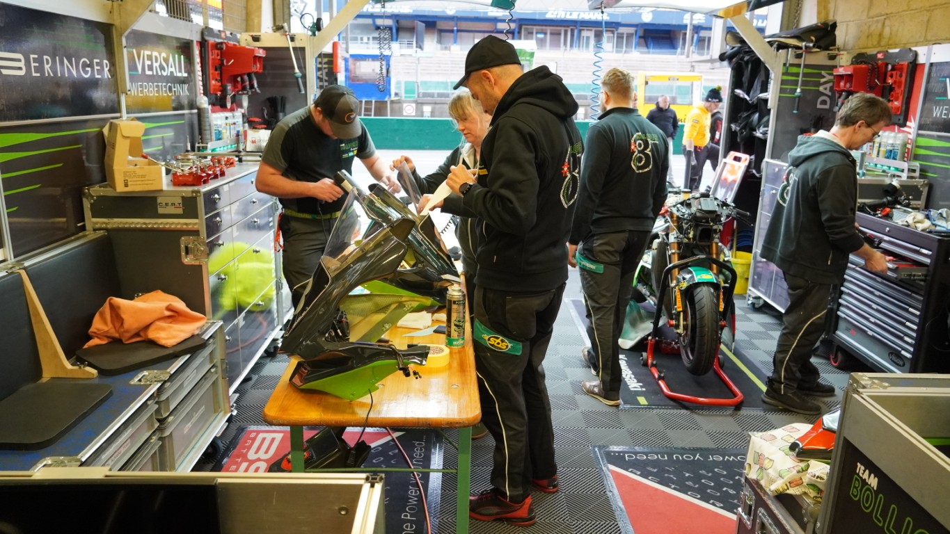 Ich nutze den Morgen, um ein Video zu schneiden. Es dauert nicht lange, bis Kevin mich ruft – die technische Abnahme steht an. Die Prüfer kommen in die Box, um die Motorräder zu inspizieren. Danach geht es in die Technical Bay (Parc fermé) – nicht zu verwechseln mit Baywatch – für die Lautstärkenmessung und das Wägen. Bei der Lärmmessung dürfen bei 5500 Umdrehungen die 105 dB nicht überschritten werden. Nach dem Rennen darf das Motorrad 3 dB lauter sein. Jeder Auspuff, auch die als Ersatz mit dabei sind, müssen geprüft werden. Das minimale Gewicht wird ebenfalls nicht unterschritten, und so ist alles in Ordnung. Sie bekommen einen Kleber mit einer Prüfnummer. Nun dürfen theoretisch beide Motorräder an den Start. Es ist jedoch bereits klar, welches Motorrad am Samstag eingesetzt wird. Das andere muss innerhalb der ersten Runde des Rennens ausserhalb der Box sein. Dort wird es dann auch gleich von Fäbu und Küsu auseinandergenommen, denn dieses Motorrad dient ab diesem Zeitpunkt als Ersatzteillager.