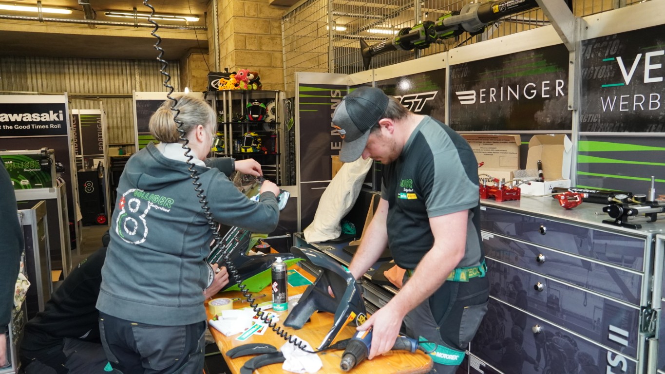 Nachdem sie den Fototermin mit allen anderen Fahrern, die beim 24-Stunden-Rennen starten, hinter sich haben, müssen sie weiter zur Fahrerbesprechung, und wir fahren zurück auf die Rennstrecke, nach Hause in die Box. Dort sind die anderen gerade dabei, die Ersatzverschalungsteile mit den entsprechenden Klebern zu versehen. Jede Front, jedes Seitenteil und jedes Heck muss gleich aussehen – und dafür sorgt das Team mit grösster Sorgfalt.