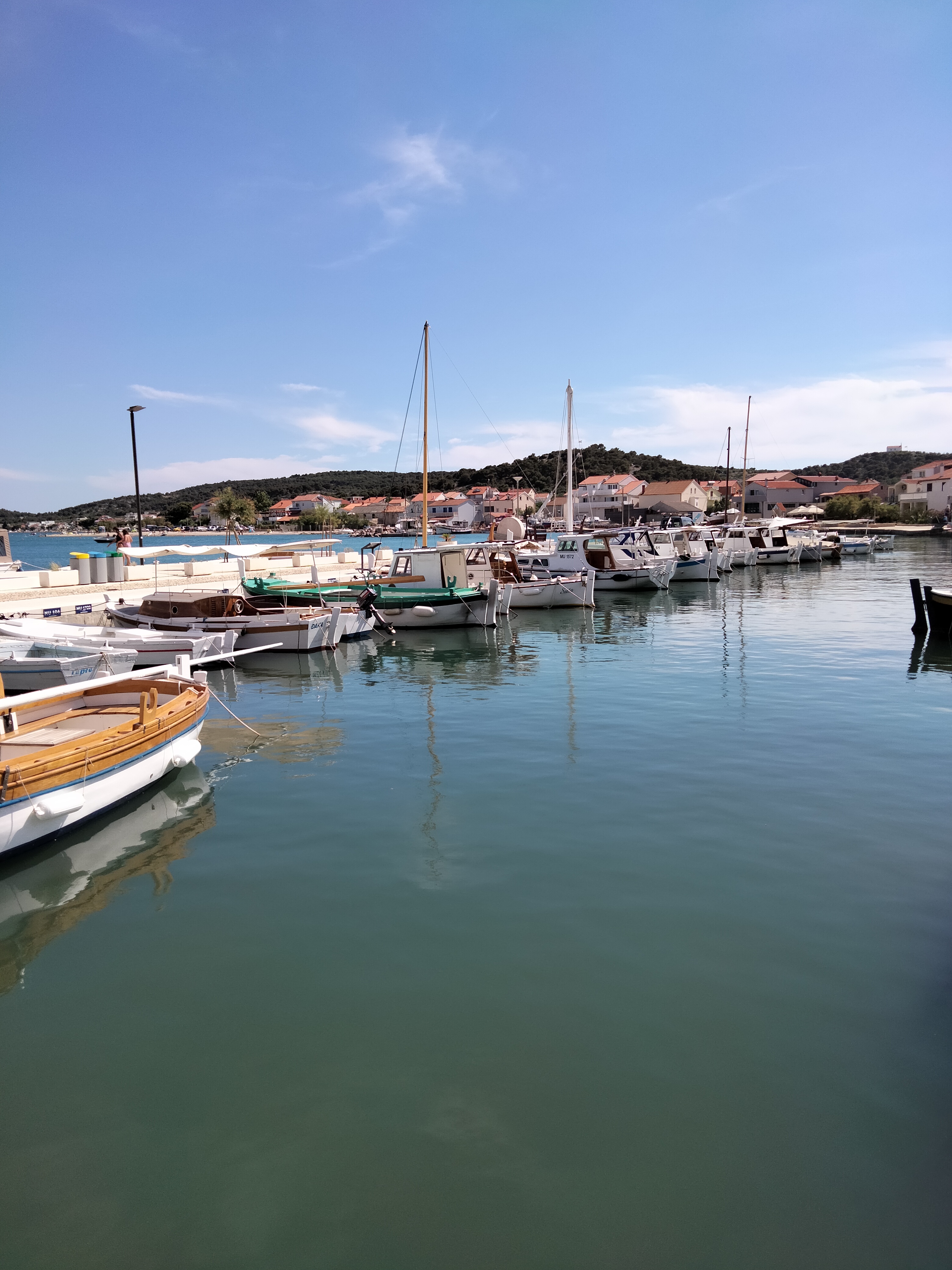 In der ferne sah man vom Camping aus ein kleines Dörfchen, so klein und fein. Ich dachte mir das kann ja nicht so weit sein und watschelte mit meinen Flipflops los. Bald war die Haut, zwischen dem grossen und dem Zeigezehen, aufgeribscht und die Flipflops schmerzten. Also zog ich sie aus und lief Barfuss weiter. Wie das ausging, dazu später. Vor dem Dörfchen hatte es einen schönen kleinen Hafen mit einer kleinen Werft wo gewerkelt wurde. An dieser Stelle muss ich zugeben, dass ich ganz gerne anderen Menschen beim arbeiten zusehe. Das Dörfchen war ganz süss und so wie ich mir ein kroatisches Dörfchen vorstelle. Unzählige kleine, verwinkelte Gassen die an schönen alten Häusern vorbei führen. Zum Abend essen gab es dann feine Meeresfrüchte als Koratioenabschluss, denn am Tag darauf ging es schon auf die Fähre nach Italien. Zurück im Zelt angekommen brannten meine Füsse, denn ich habe sie auf dem heissen Asphalt verbrennt, dumm. Den Tag lies ich dann am Strand ausklingen, genoss den Sonnenuntergang und sammelte Muscheln. Dass die eine noch eine „lebendige“ war merkte ich erst Zuhause.