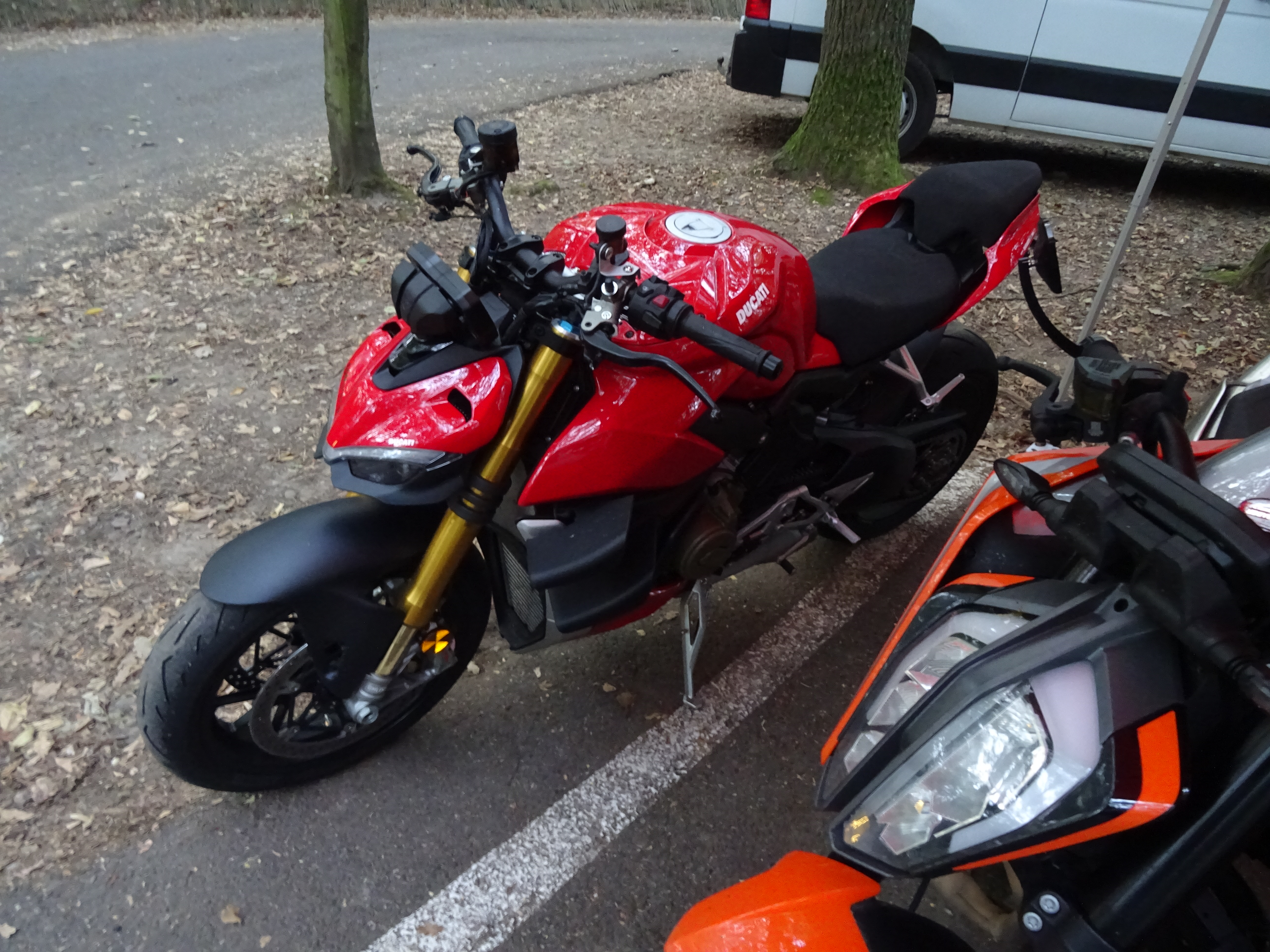 Die erste Gruppe die am Morgen auf die Strecke ging waren die Schnellen. Zwei Freunde waren mit je einer Aprilia mit dabei. Es wurden immer Turns von 20 Minuten gefahren. Leider fuhr die erste Aprilia schon nach zehn Minuten raus. Eine Aprilia RSV4 RR. In diesem Fall stand das RR für "rassel rassel". Eine Ventilfeder ist gebrochen. Dies war zum Glück die einzige Panne. Er durfte dann den Rest vom Tag auf der Streetfighter verbringen.